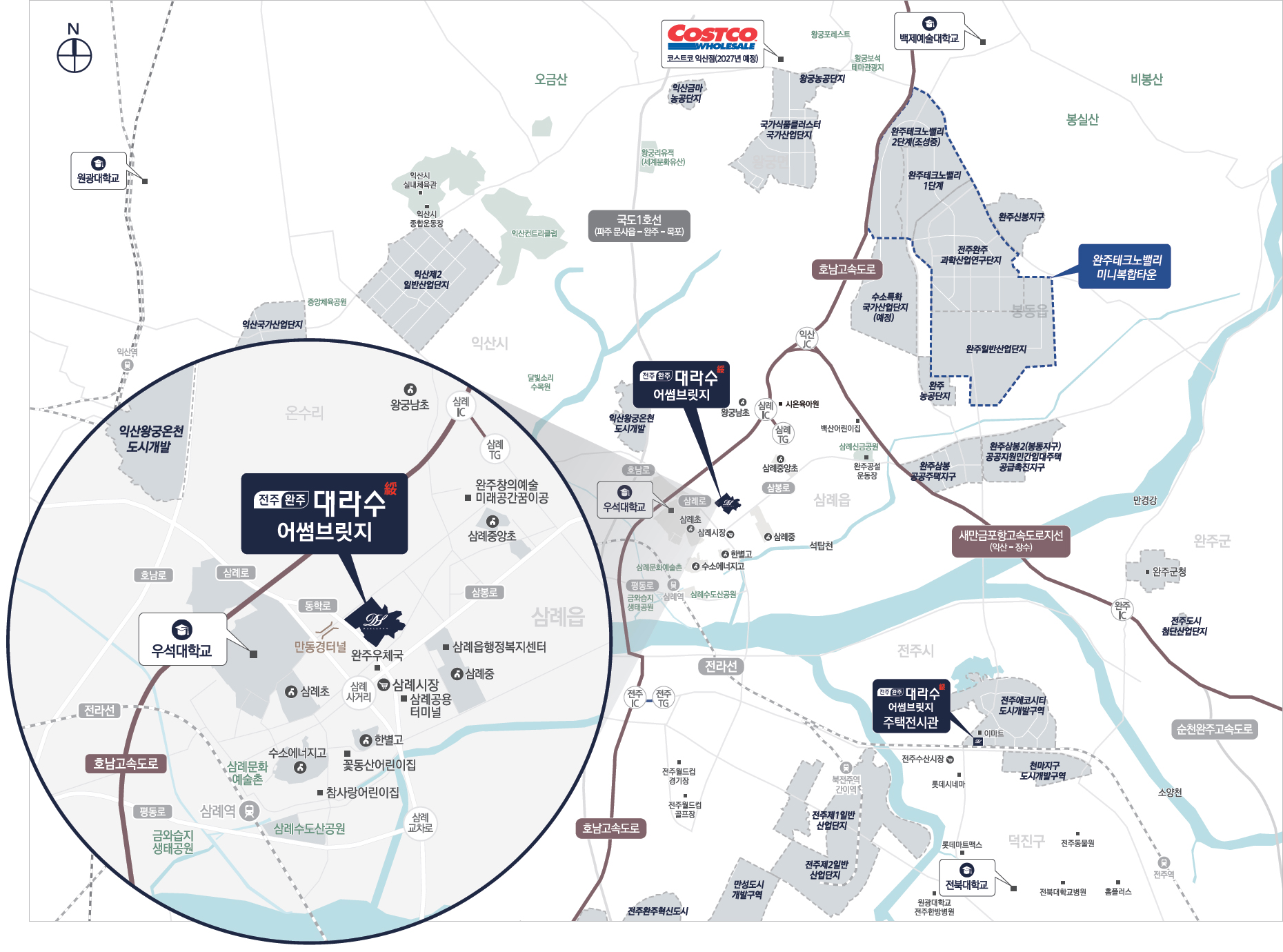 전주에코시티와 삼례 중심상업시설, 코스트코 익산점(2027년 예정), 시장, 마트, 병원, 행정센터 등