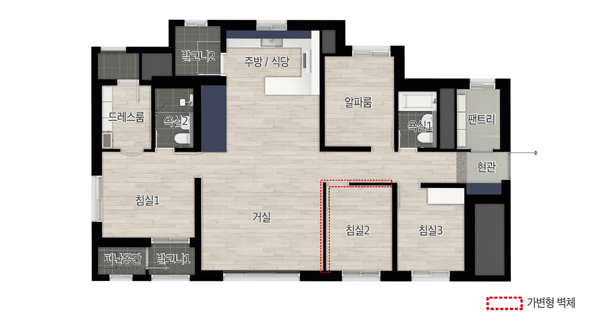 세대간 조건에 따라 단일재의 위치, 벽체의 두께, 세대간 마감 등이 상이할 수 있으며, 확장 부위는 직접 외기에 인해 상대적인 추위를 느낄 수 있습니다.
