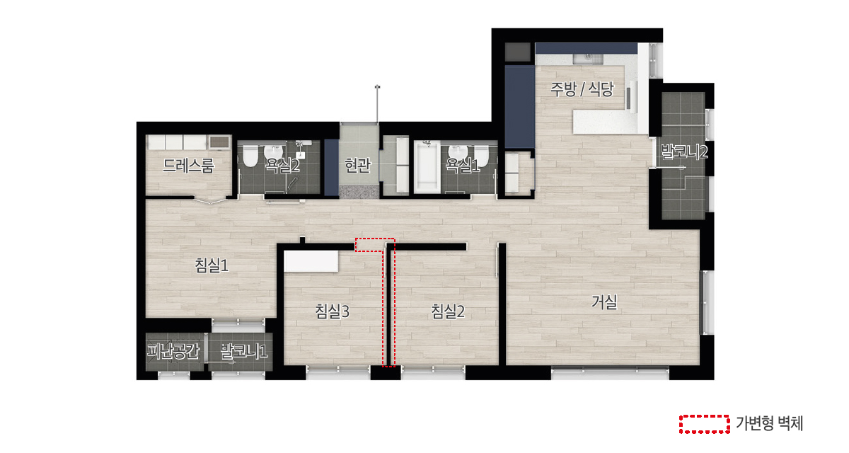 세대간 조건에 따라 단일재의 위치, 벽체의 두께, 세대간 마감 등이 상이할 수 있으며, 확장 부위는 직접 외기에 인해 상대적인 추위를 느낄 수 있습니다.