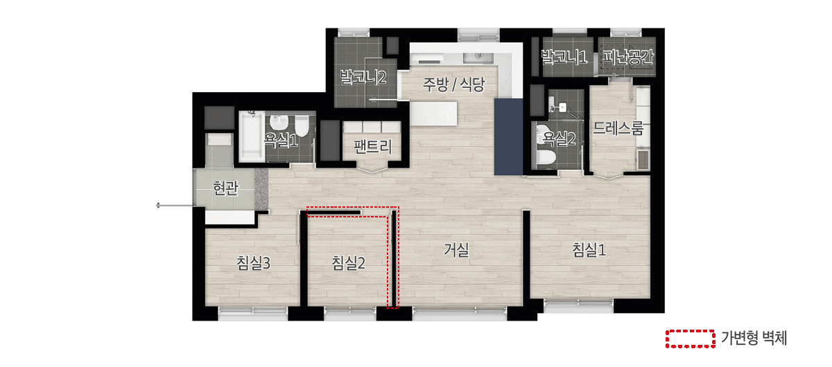 세대간 조건에 따라 단일재의 위치, 벽체의 두께, 세대간 마감 등이 상이할 수 있으며, 확장 부위는 직접 외기에 인해 상대적인 추위를 느낄 수 있습니다.